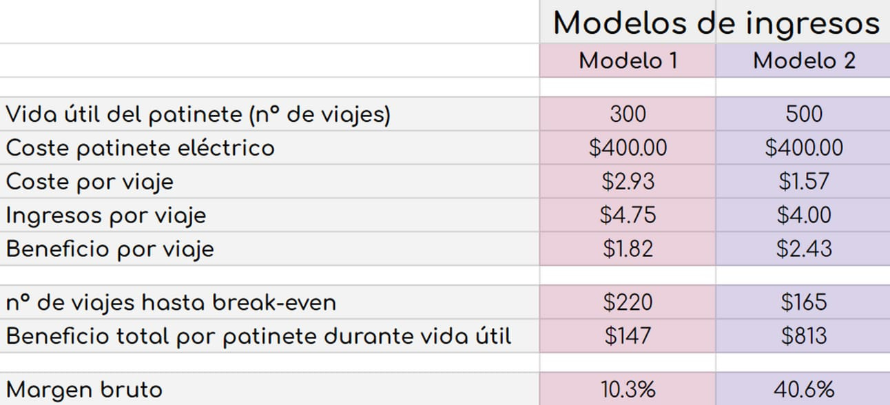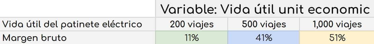 En el anterio caso vemos como simplemente teniendo un mejor mantenimiento del producto o mejorando este, con una mayor penetración y cuota de mercado, y con una mayor adopción del usuario por la opción de cargar el patinete, el margen bruto por unit economic es del 40,6%, versus el 10,3% con el anterior modelo. A continuación la comparativa en ambos modelos: