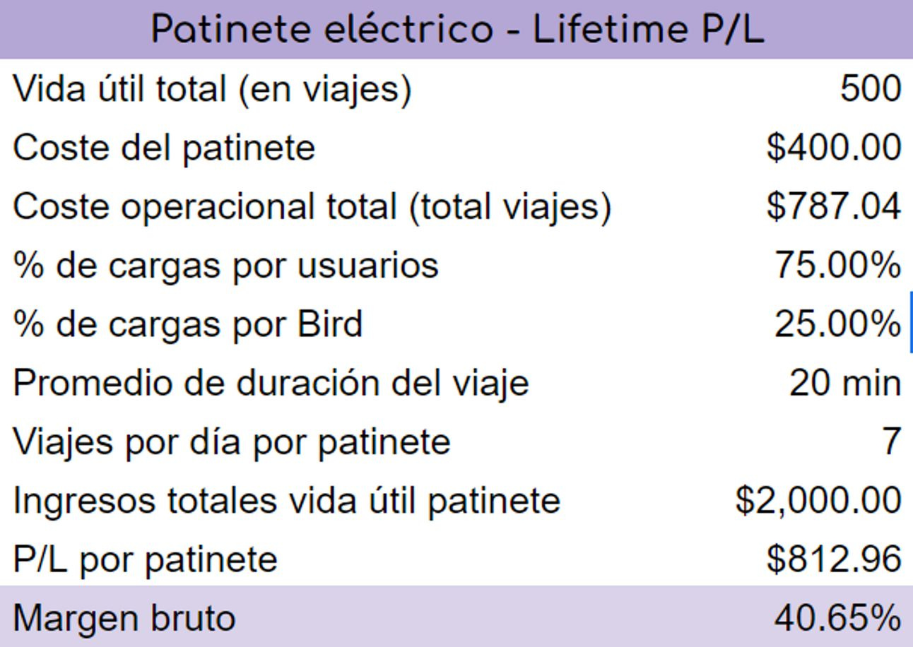 En el modelo de Bird tiene una importancia vital el patinete o bicicleta que se alquila. En este caso, se utilizará el patinete eléctrico como unidad de medida y unit economic, para así medir la rentabilidad y sostenibilidad del modelo de la startup.