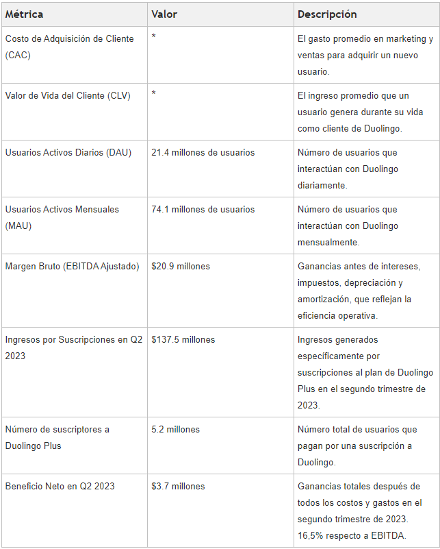 *Por desgracia, la información del CAC (Costo de Adquisición del Cliente) y el LTV (Lifetime Value) no son públicos. El CAC aún así se puede determinar que es muy bajo en comparación a otras empresas, debido a que el “único” costo a contabilizar en este apartado sería el de personal dedicado a marketing y ventas en la compañía, dejando más de lado el de las campañas publicitarias realizadas, ya que no son muchas de acuerdo a los reportes oficiales. En cuanto al LTV, este se puede considerar elevado, ya que la retención de usuarios es una métrica clave en Duolingo fomentando de forma constante la actividad de estos y su renovación en el plan mensual Duolingo Plus en el tiempo.