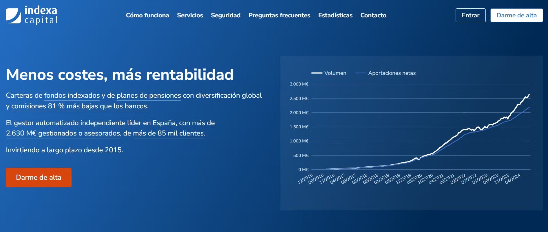 Actualmente Indexa gestiona más de 2.500 M€ y cuentan con 80k clientes, siendo la cartera media por cliente de 30k€.