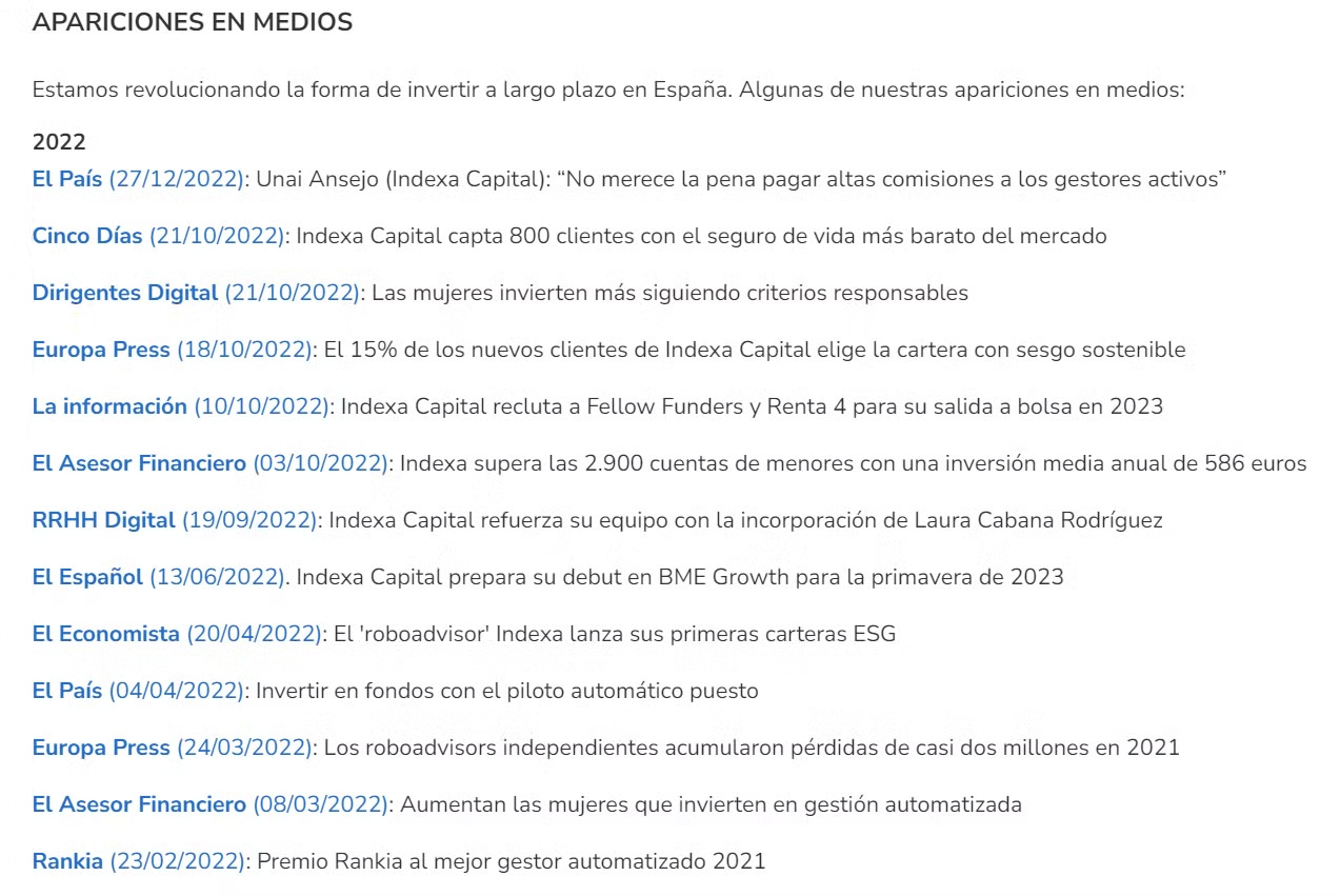 Aparición en medios digitales: alguna colaboración como podcast en canales de finanzas donde hacen llegar Indexa Capital a un nuevo público.